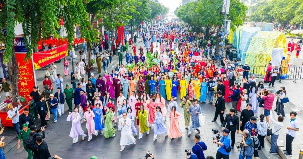 Sự kiện thu hút hơn 58.000 người tham gia tại 35 điểm đồng diễn trên toàn thành phố, tạo nên một “biển áo dài” đầy màu sắc giữa trung tâm đô thị năng động.